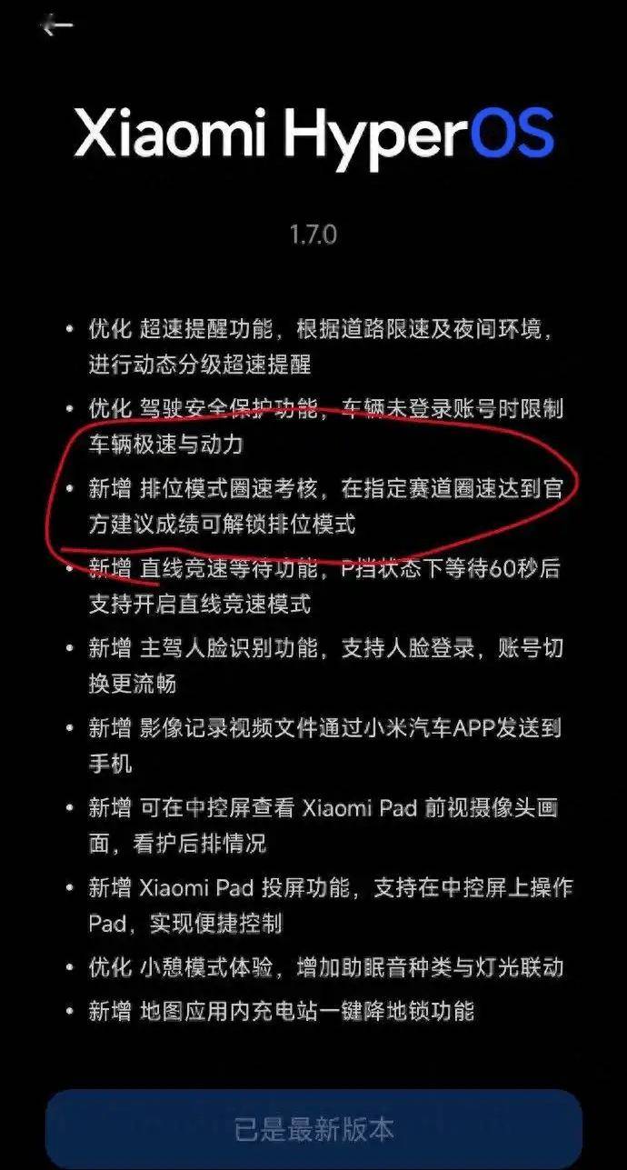 2025年5月1日,小米汽车针对其旗舰车型SU7 Ultra发布了系统更新,新增了“排位模式圈速考核”功能。根据更新内容,车主需要在官方指定赛道上达到系统设定的圈速标准,才能解锁车辆的最大马力1548PS。此外,该版本还新增了直线竞速等待功能,车主在P挡状态下等待60秒后才能开启直线竞速模式,限制了车主在等红绿灯时进行“弹射起步”的行为。此前,车主只需完成《驾驶安全注意事项》的学习并通过驾驶安全测试,即可解锁直线竞速模式和赛道模式。
