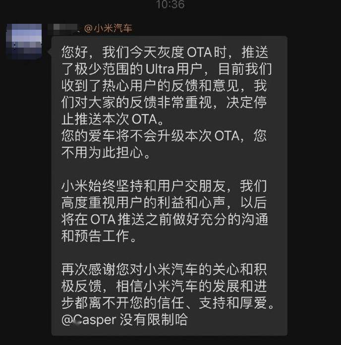 这一更新引发了车主和网友的广泛讨论。部分车主认为,限制马力的出发点是为了安全,但小米汽车在实施过程中没有充分征求车主意见,也没有提前告知。许多车主表示,他们购买SU7 Ultra正是因为其强大的性能,而限制马力让他们感到失望。另一方面,也有部分用户对小米的灰度测试表示肯定,认为这种方式在一定程度上保障了车辆的安全性。他们认为,通过逐步放开马力限制,小米可以在确保用户安全的前提下,逐渐提升车辆的性能,减少潜在的安全隐患。面对用户的反馈和争议,小米汽车官方迅速作出回应:官方决定停止推送本次OTA。