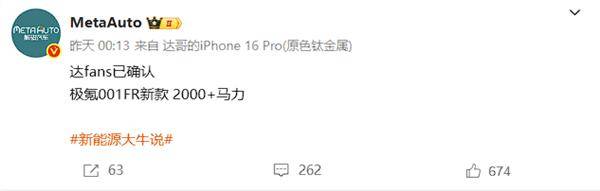 当然了,依托吉利集团,极氪自然不可能认输,近日,多名汽车博主爆料称,全新极氪001 FR的动力输出超过2000马力!