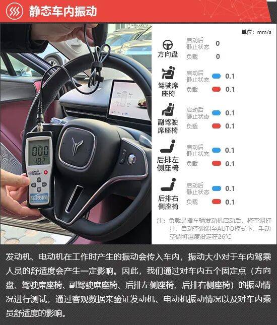 在静态车内振动测试环节,启动后静止和负载两种状态下,2026款岚图追光 L方向盘处的振动数值始终为0,前后排座椅的振动数值均为0.1mm/s,并且保持不变,实际体感轻微。