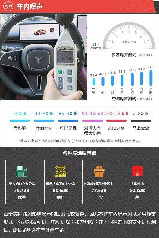 在静态噪声测试环节,2026款岚图追光 L在启动状态下车内实测噪声值为31.4dB,在测试过的同级别车型中处于中上游水平。由于评测车搭载插电式混合动力系统,启动状态下发动机默认不工作,因此无法对2000rpm以及3000rpm的噪声进行测试。