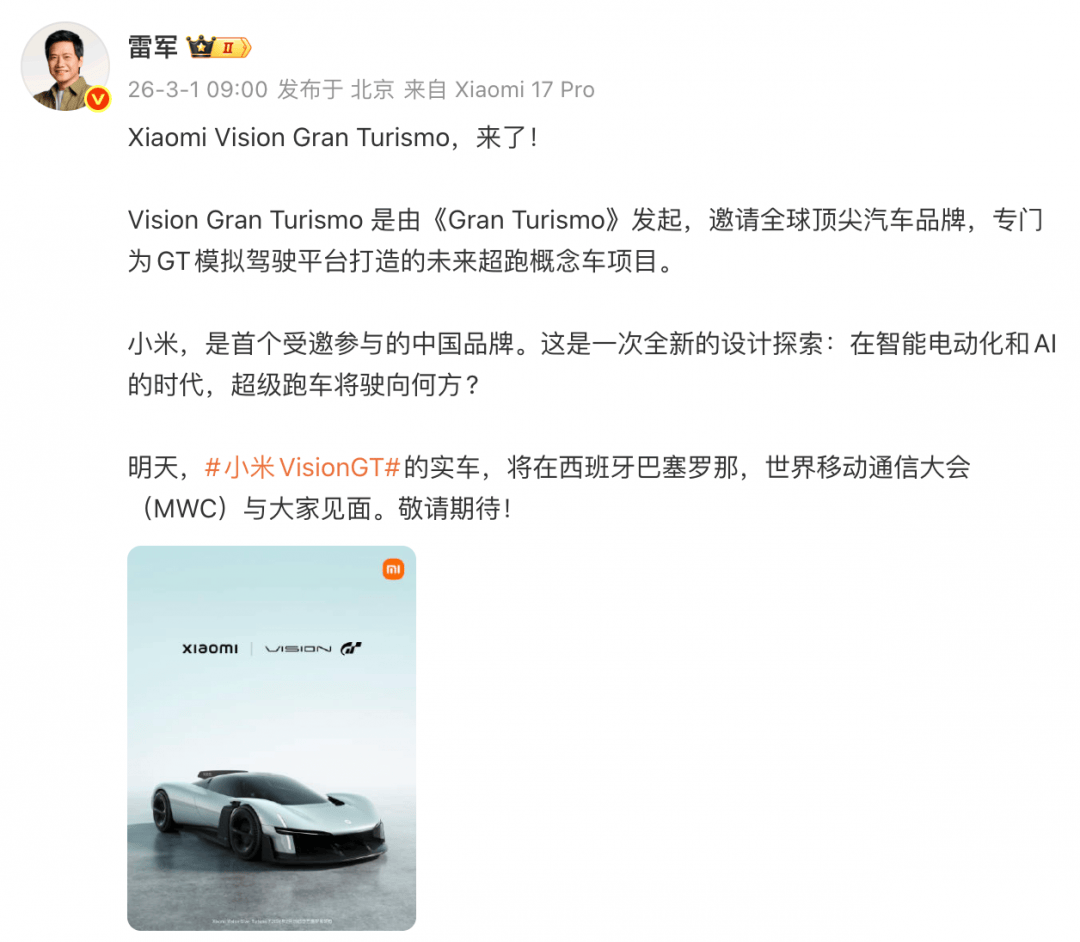 雷军在微博正式宣布,明天,#小米VisionGT#的实车,将在西班牙巴塞罗那,世界移动通信大会(MWC)与大家见面。
