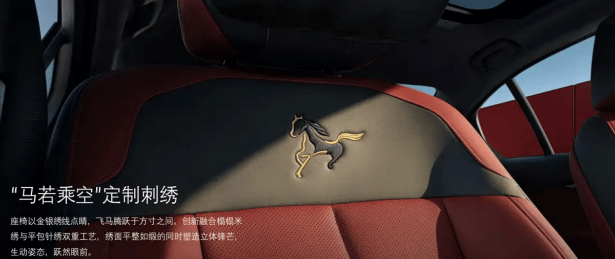 相较于普通版,马年版新车融入马年专属元素,例如首次引入个性化定制磨砂宝石青车漆,搭配熏黑设计轮圈。内饰方面,其前排座椅头枕和靠背上有不同的跃马刺绣图案,以及专属的迎宾踏板,仪式感拉满。
