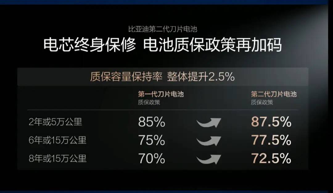怎么证明?相比第一代刀片电池的值质保政策,比亚迪直接把二代刀片电池的质保标准提升了2.5个百分点,电芯终身保修。这是一种只有技术绝对自信才敢玩的“霸王条款”。