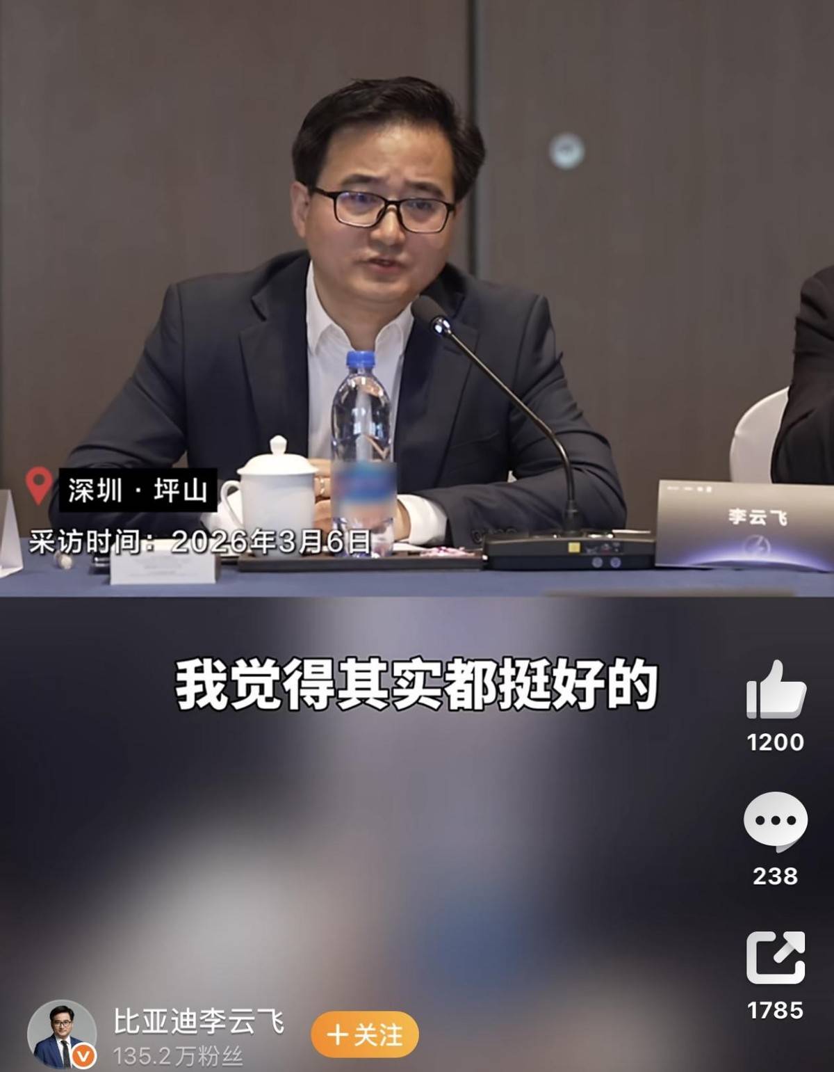 按理说,你们都在说我的闪充不行,我得一条条怼回去才对,可李云飞偏偏没有。他不仅没怼换电,反而主动递了台阶。这其实也恰恰印证了,比亚迪对这项技术确实自信,可以不需要通过拉踩换电来进行证明。